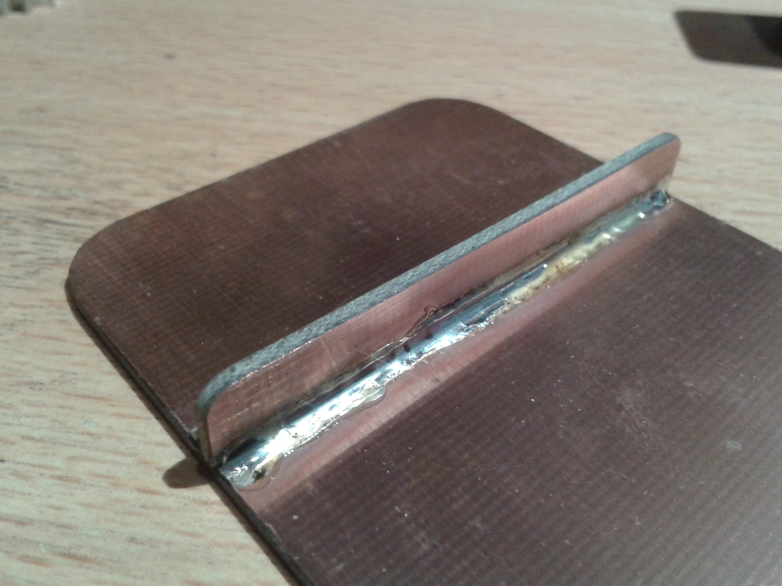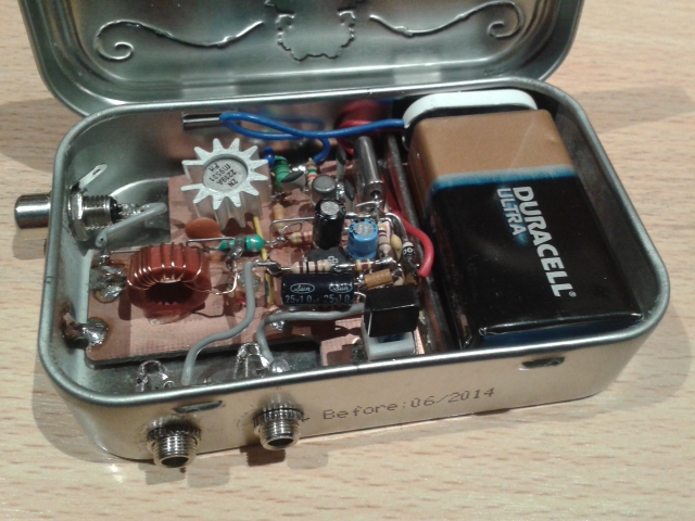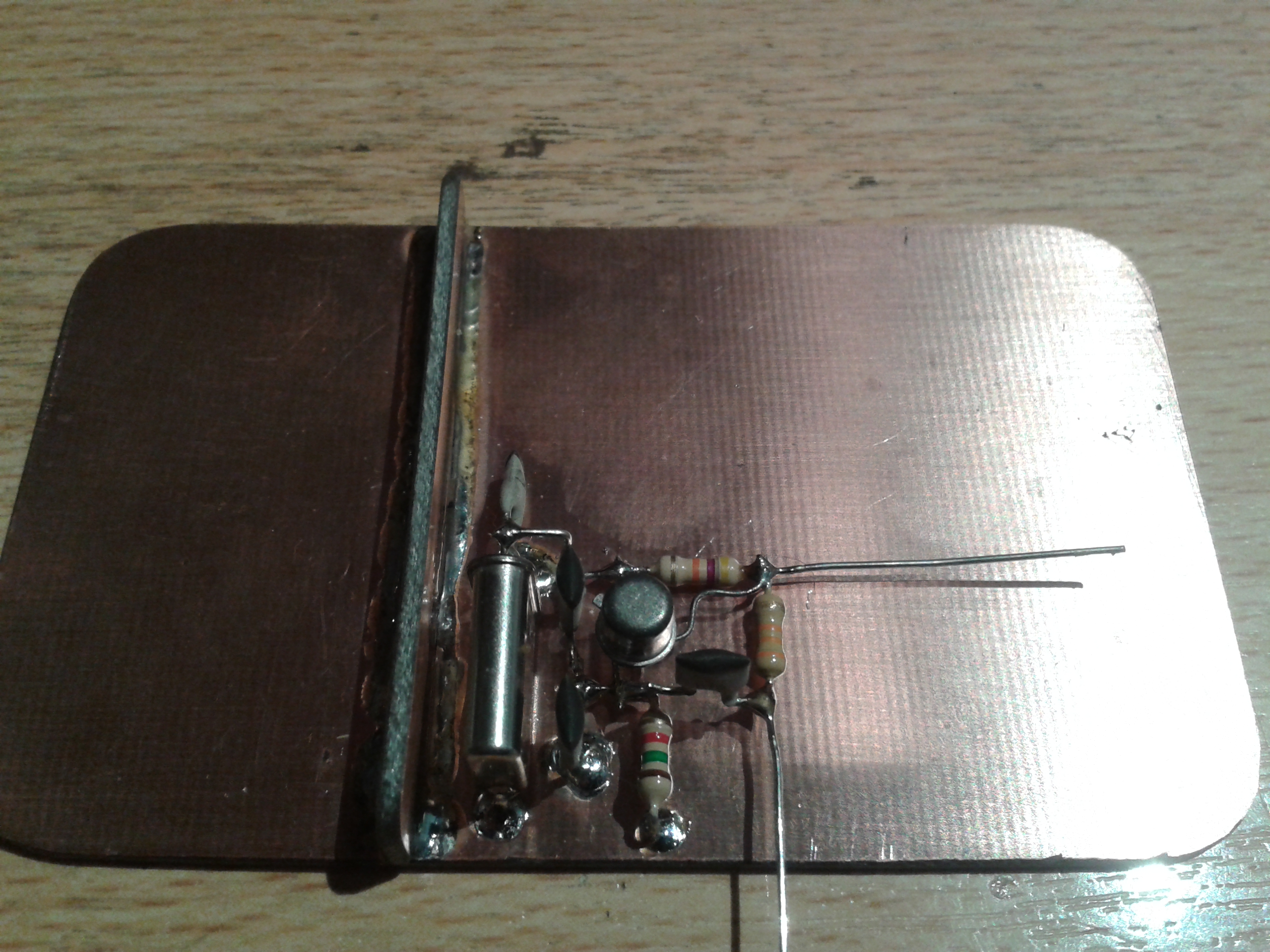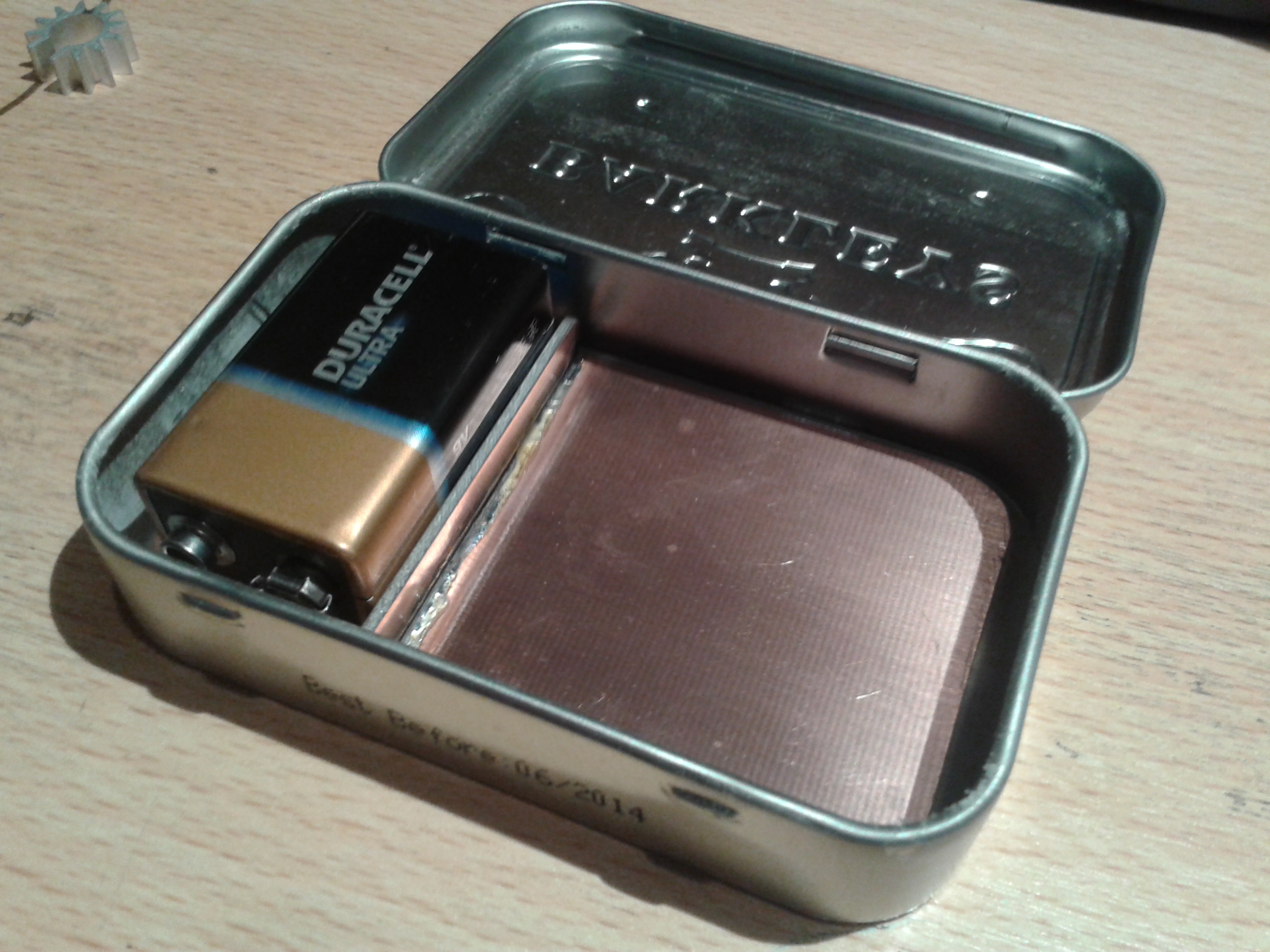 Building was rather straight-forward. I started with a piece of copper clad, fitting on the bottom of the tin. I soldered another small sheet of copper clad on top of the bottom, to keep the battery away from the circuit.