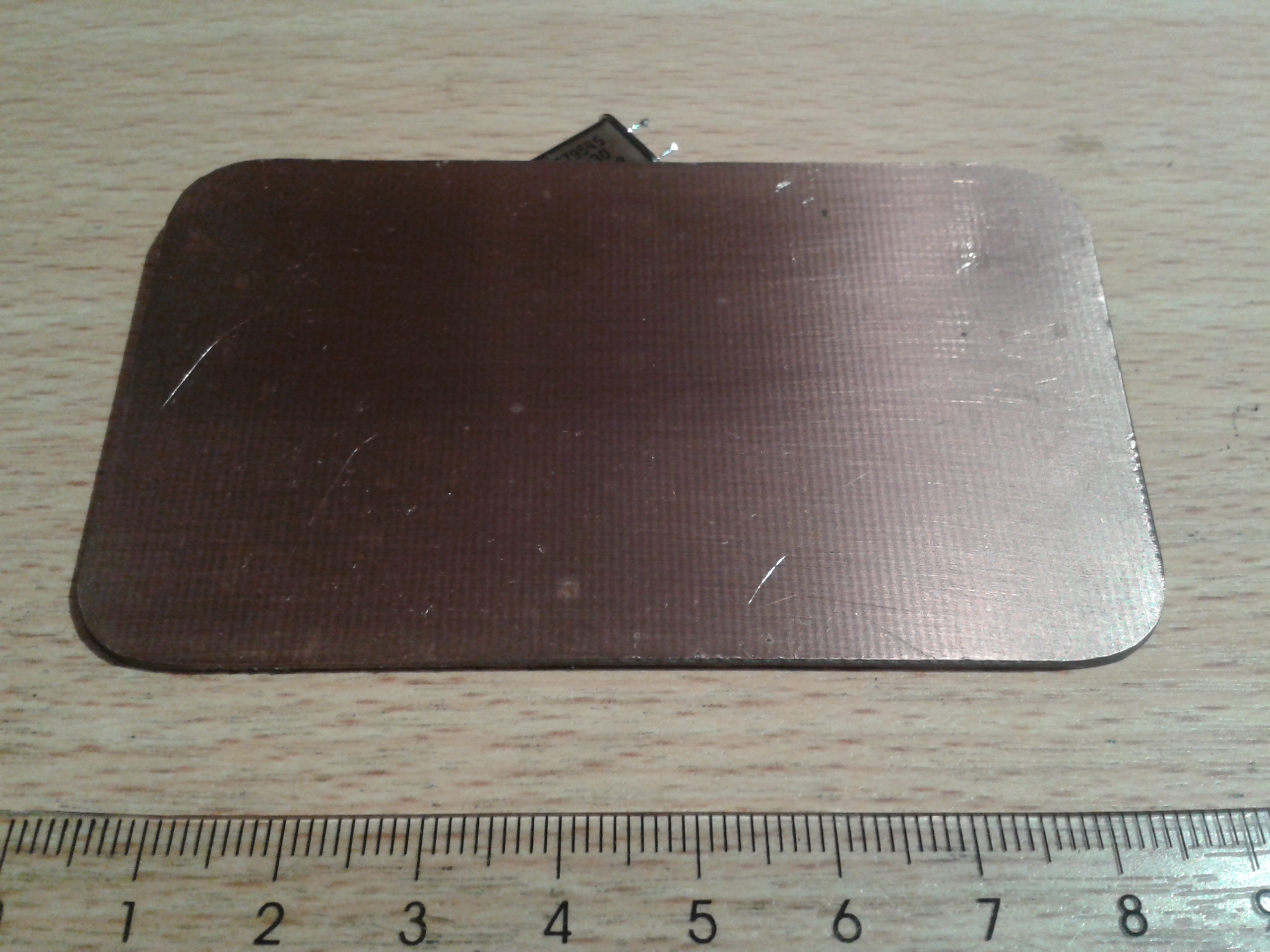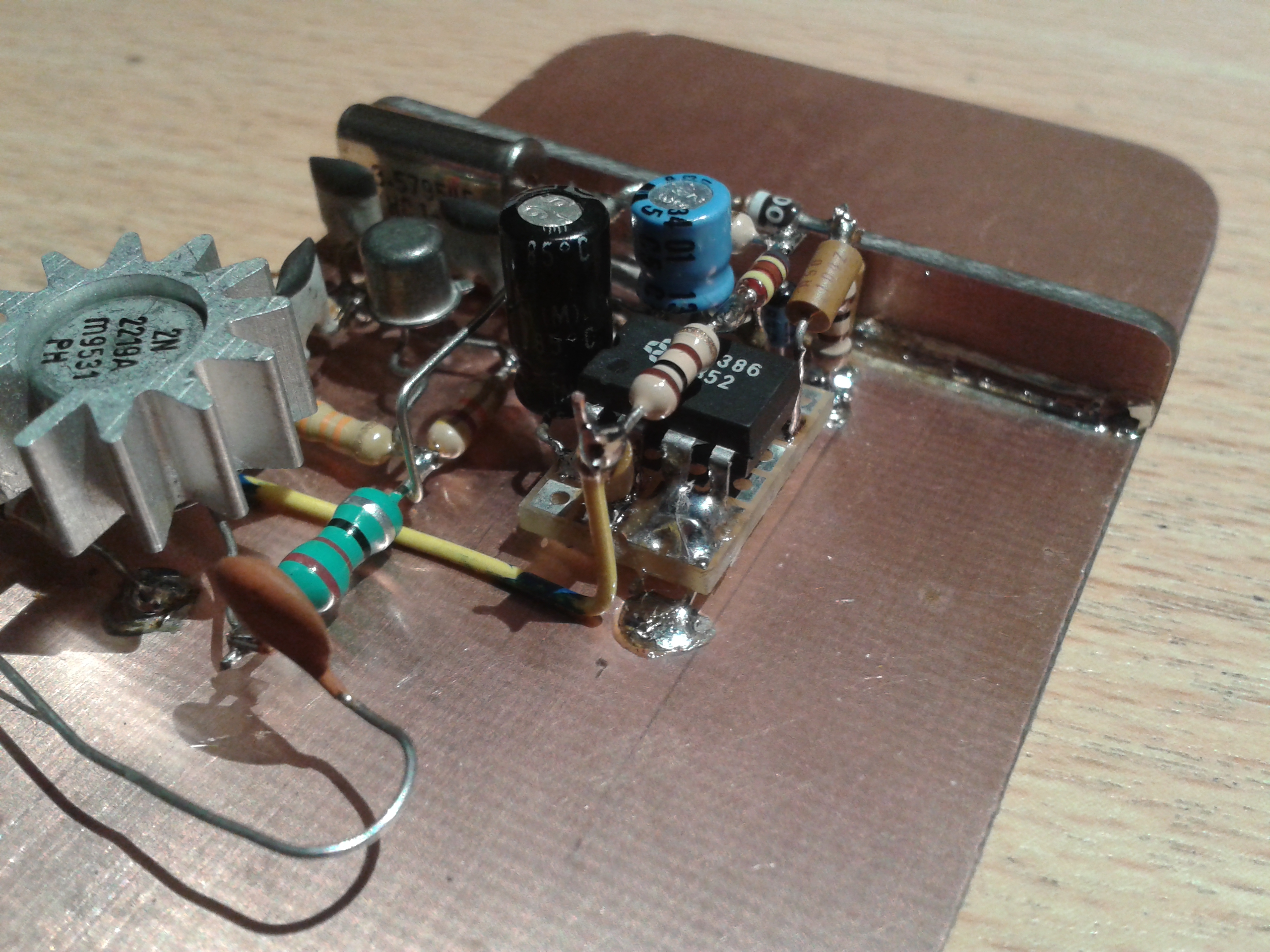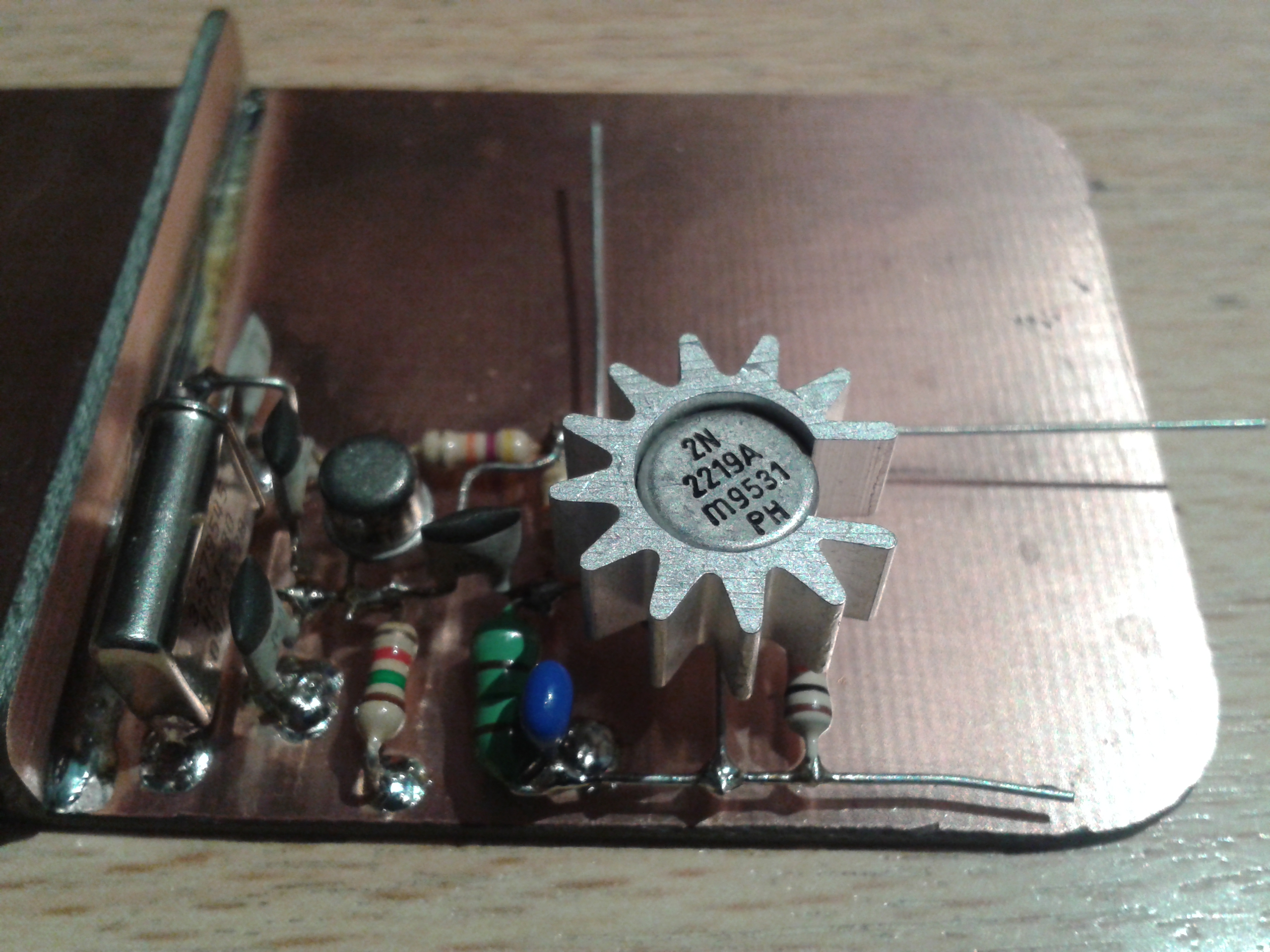 Building was rather straight-forward. I started with a piece of copper clad, fitting on the bottom of the tin. I soldered another small sheet of copper clad on top of the bottom, to keep the battery away from the circuit.
