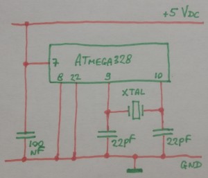 To run without the Arduino board, the microcontroller requires a 5 Volt power supply and some components to complete the onboard oscillator: a 16 MHz crystal and two 22 pF capacitors. No external parts are required for reset, POR is fully handled internally.