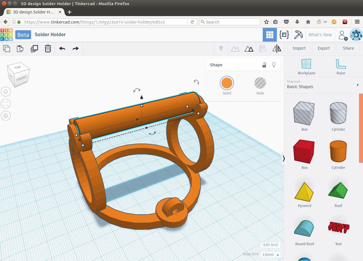Since I’m not that familiar with Blender, I looked around for alternatives and found a free online 3D editor called Tinkercad. I succeeded in drawing a nice spool holder. I applied lots of circles in the design, since the spool itself has a circular shape too.