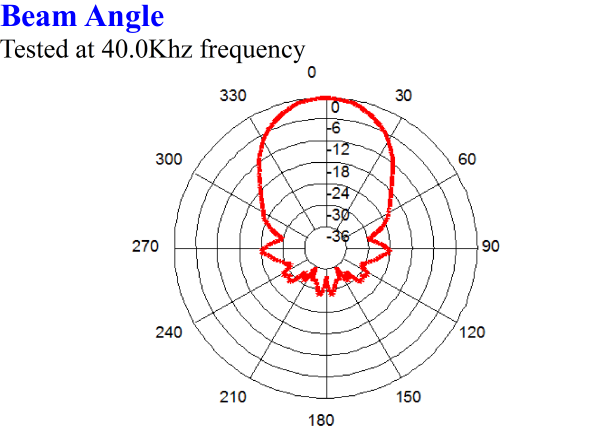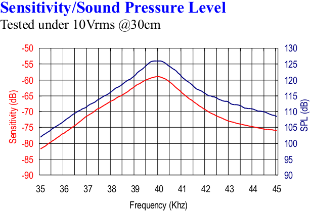 I also 3D-printed a holder for the ultrasonic transducer. I once bought a bunch of 400SR160 piezo sensors, since building a bat detector was in my mind for quite a long time. Nowadays I learned these sensors are sub-optimal, since they have a very limited frequency range of about 2.5 kHz. Still, they seem to be used quite often in bat detectors, so I decided to give it a try. Some more numbers: the center frequency is 40 kHz, while the radiation pattern shows a beam width of 55 degrees. Down here are two graphs from the 400SR160 datasheet to illustrate these numbers: