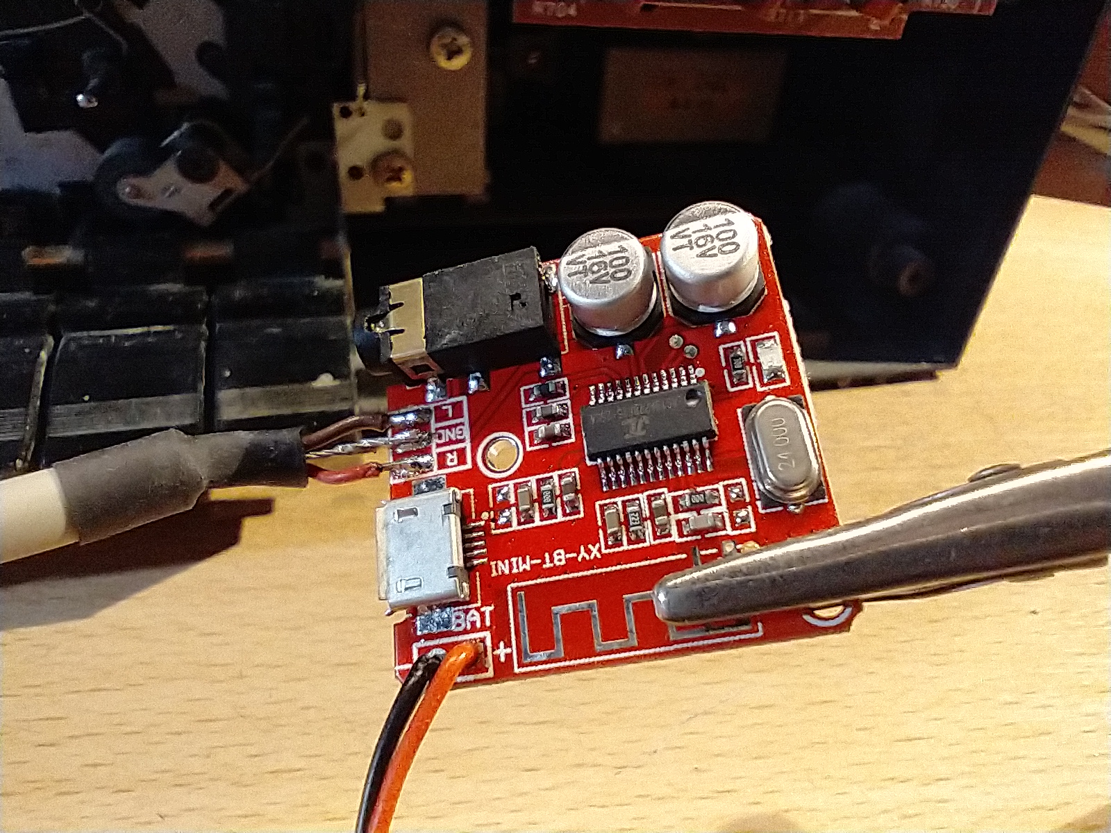 Finally I soldered the audio wires and DC to the bluetooth board itself: