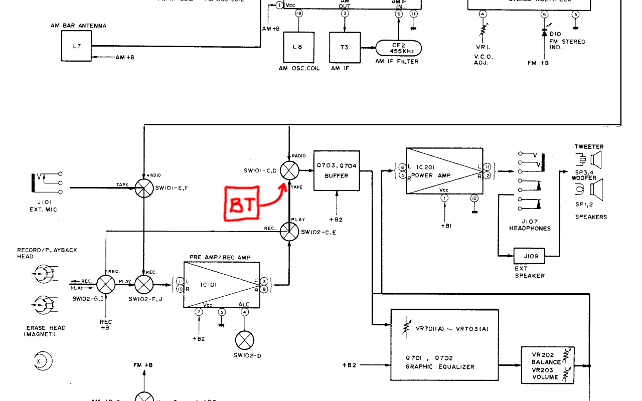 The diagram tells me that there must be some switch labeled SW101, which selects the input (radio or tape). This happened to be a very long switch, engaged by the play-button of the cassette player. I soldered wires on the correct pins to hook up the bluetooth board: