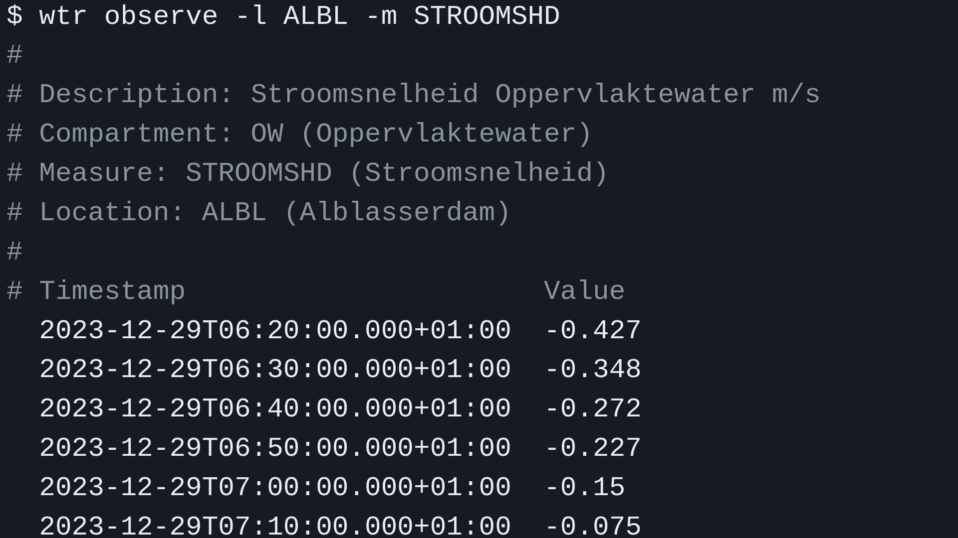 $ wtr observe -l ALBL -m STROOMSHD -r 144 # 24 hours