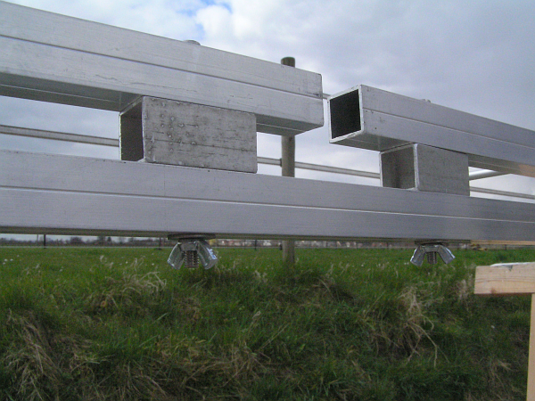 The picture above shows 3 bars, each 2500mm. The bars are bolted together according to the above picture. The middle section is just a small part of another bar. A hole is drilled through the three bars. A 70mm bolt is then put into the hole and closed with a wing nut. Apply wide washers on both ends of the bolt connection to get a more solid construction.