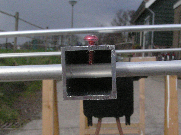 The picture above shows the way each element is mounted through the boom. A hole is drilled at both sides which will hold the element. A smaller second hole is drilled in the top side of the bar, to fit a self-drilling screw.