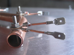 On the ground a net of wires is made, in a star shape. The center of this net is a ring made of copper pipe. Holes are drilled into that pipe, to hold bolts and nuts to connect the wires. I added some AMP-connectors to enable easy connecting/disconnecting the ground wires. The ground wires itself have different lengths. We started with 4 wires of 15m, 4 of 10m, and 8 of 5m. The wires are laying on the ground. Put the 15m wires in each wind direction, the 10m wires inbetween them, and then the 5m wires inbetween the 10 and 15m wires.