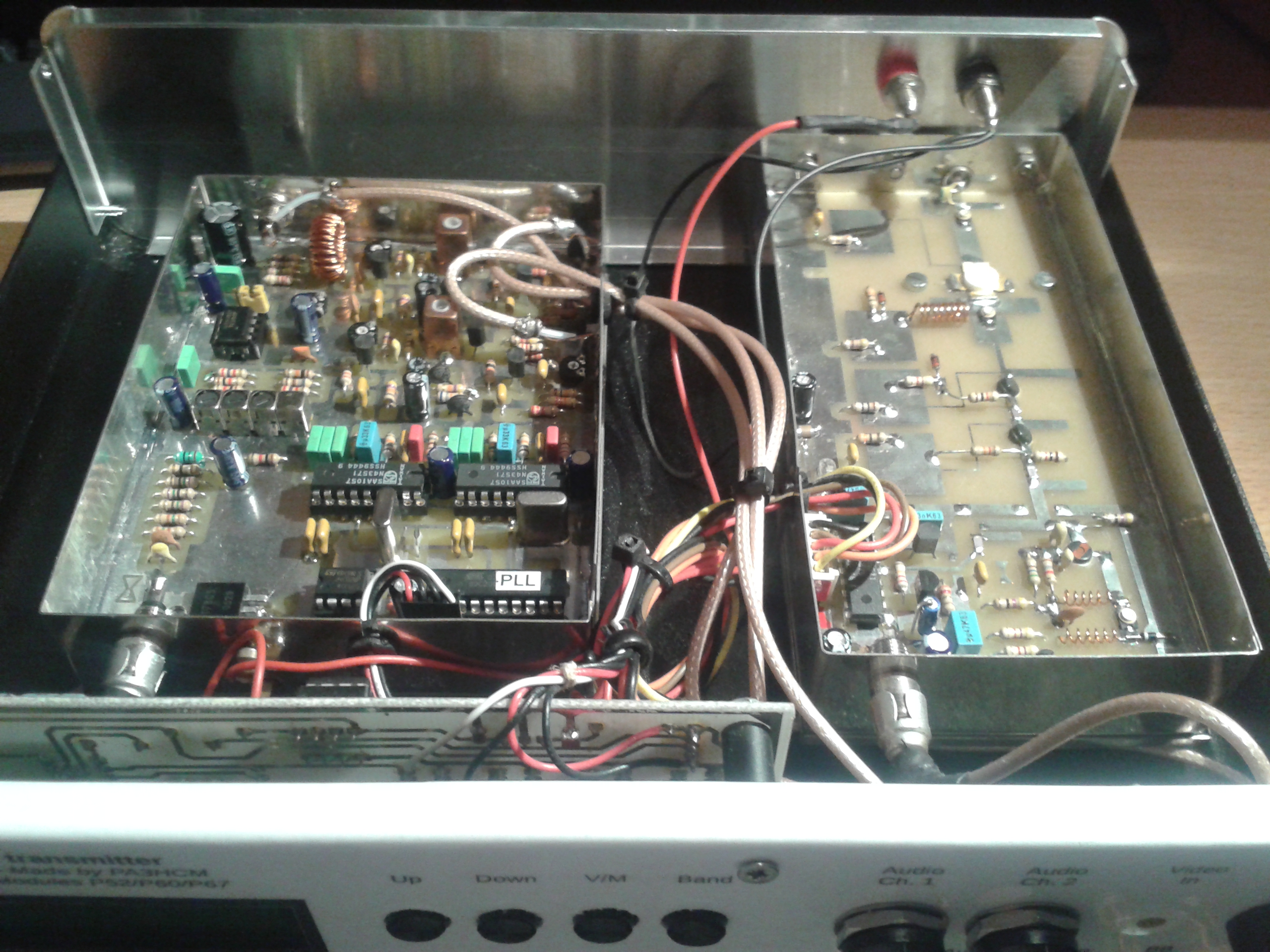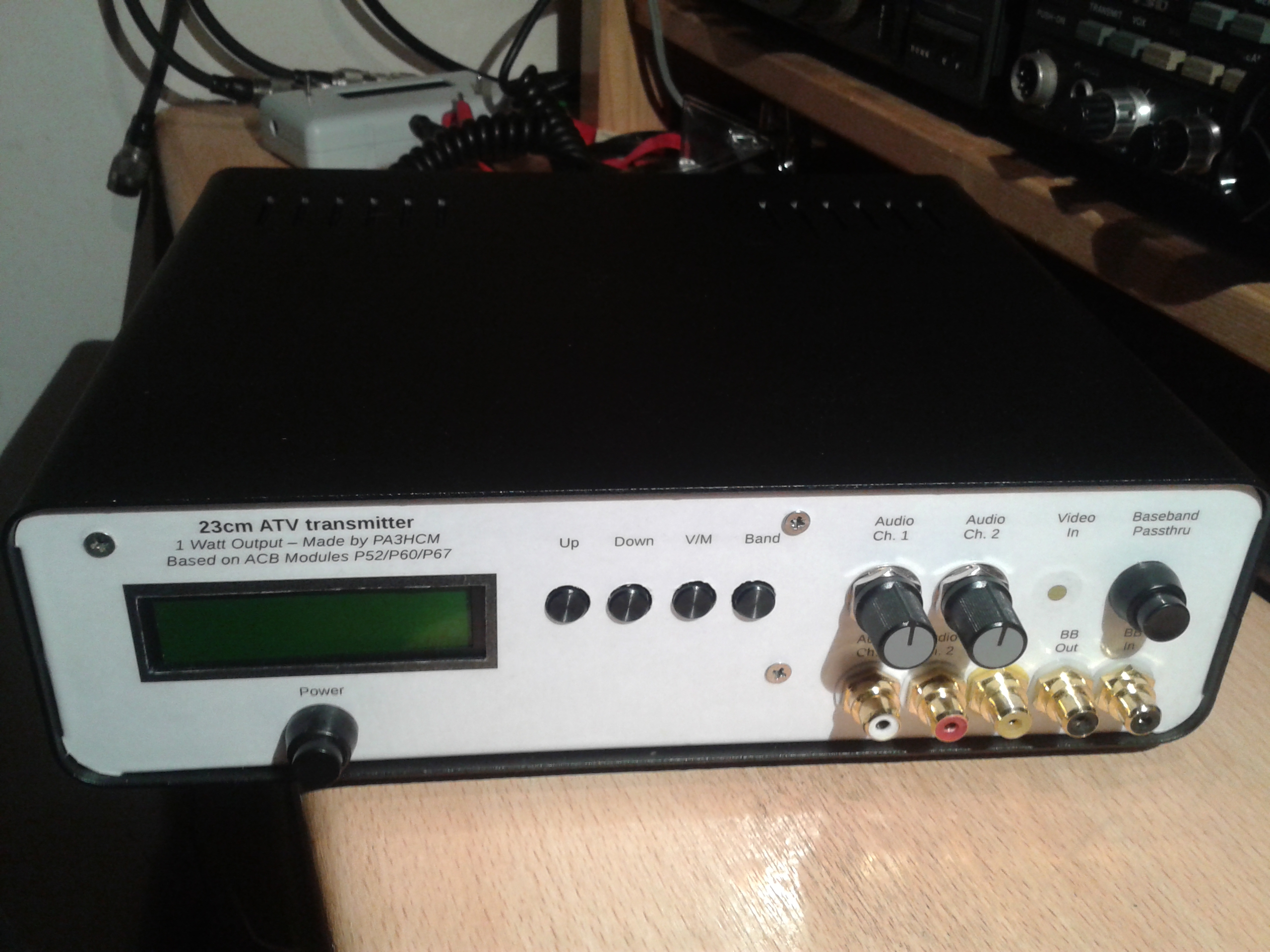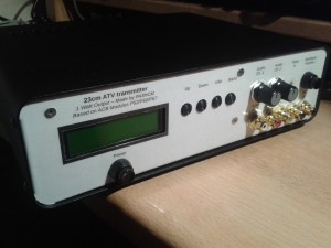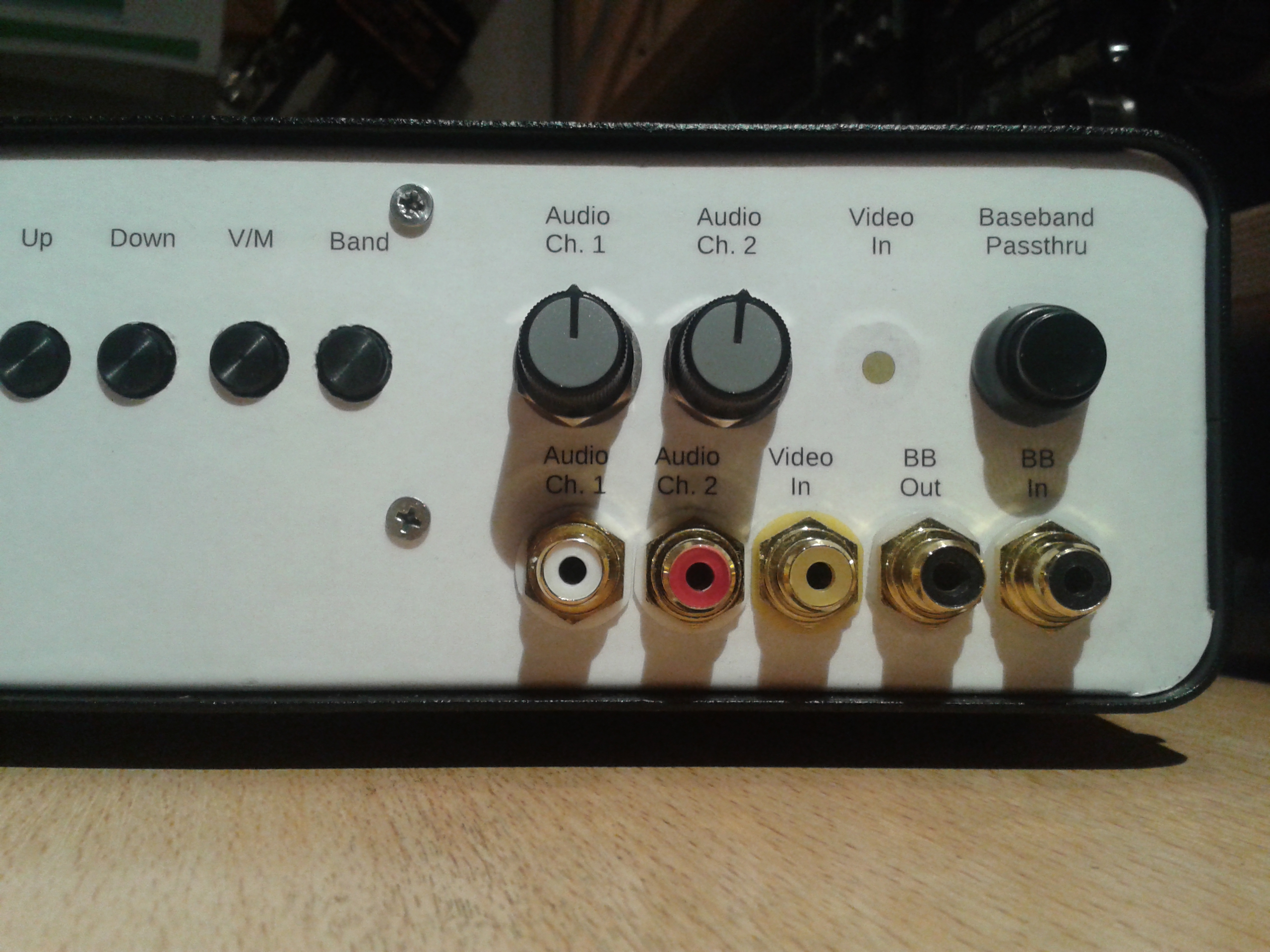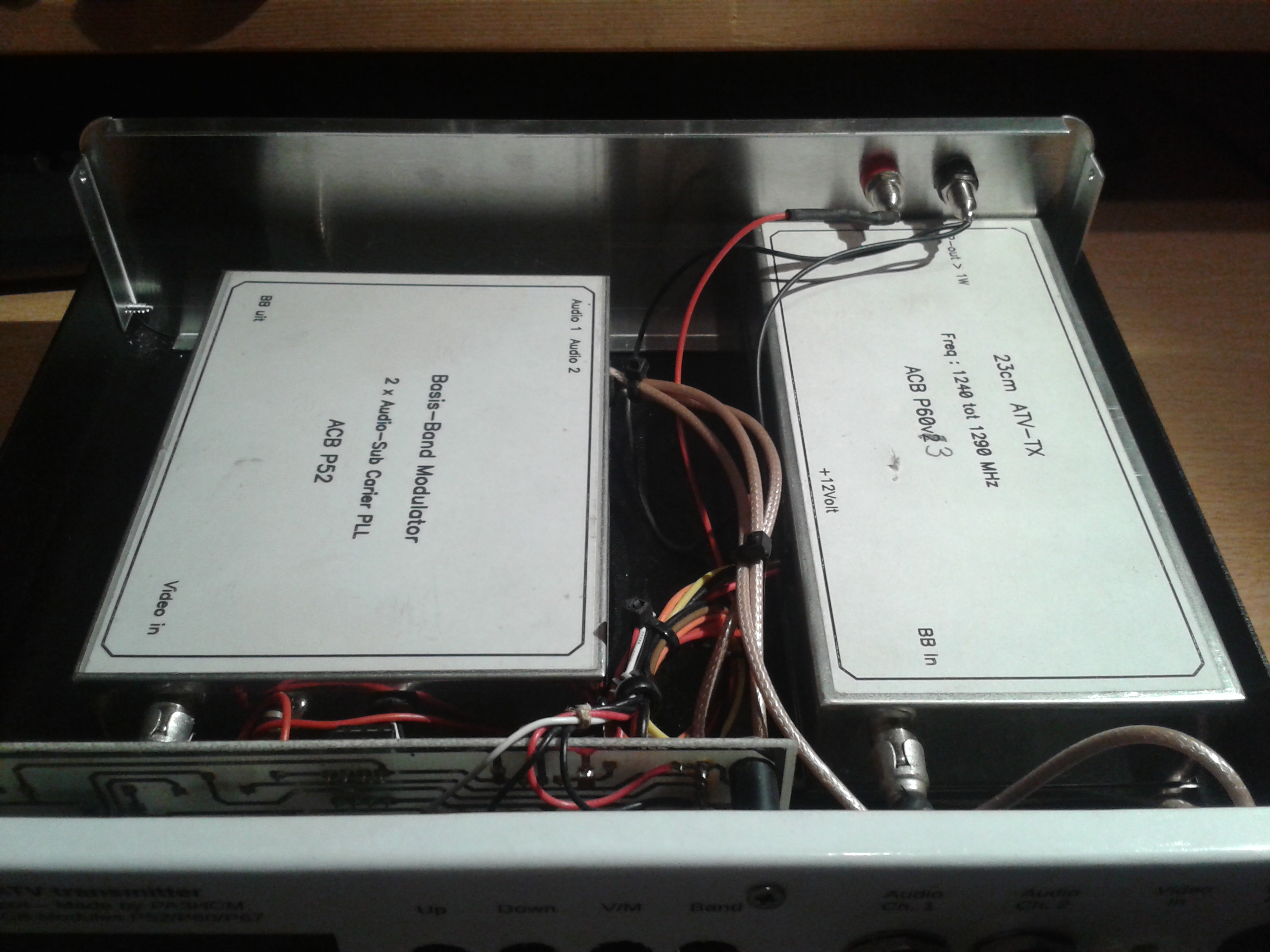 The first thing to do was testing the modules. So I connected the modules to each other, attached an antenna and camera, and powered up the system. I pointed the antenna to the ATV repeater, and saw my own picture at the output signal. So everything seemed to work! Next I bought a nice case to put in these modules, and some related stuff like connectors and potmeters. One of the issues is creating a nice front. This is the way I do it: I print the design on a self-adhesive label, stick this on the (drilled) metal front, and protect it by covering it with book foil (in the Netherlands also known as “Boeklon”). Then I use a sharp knife to cut out the holes of the label and foil. Making fronts this way is easy and cheap, with great result. The downside is that the paper will color a bit over the years, but I don’t care too much about that. To connect all audio and video signals I used thin teflon coax. This might sound a bit expensive, but you will need just 1 meter, and you don’t have to worry about shortened wires; the isolation will survive all soldering.