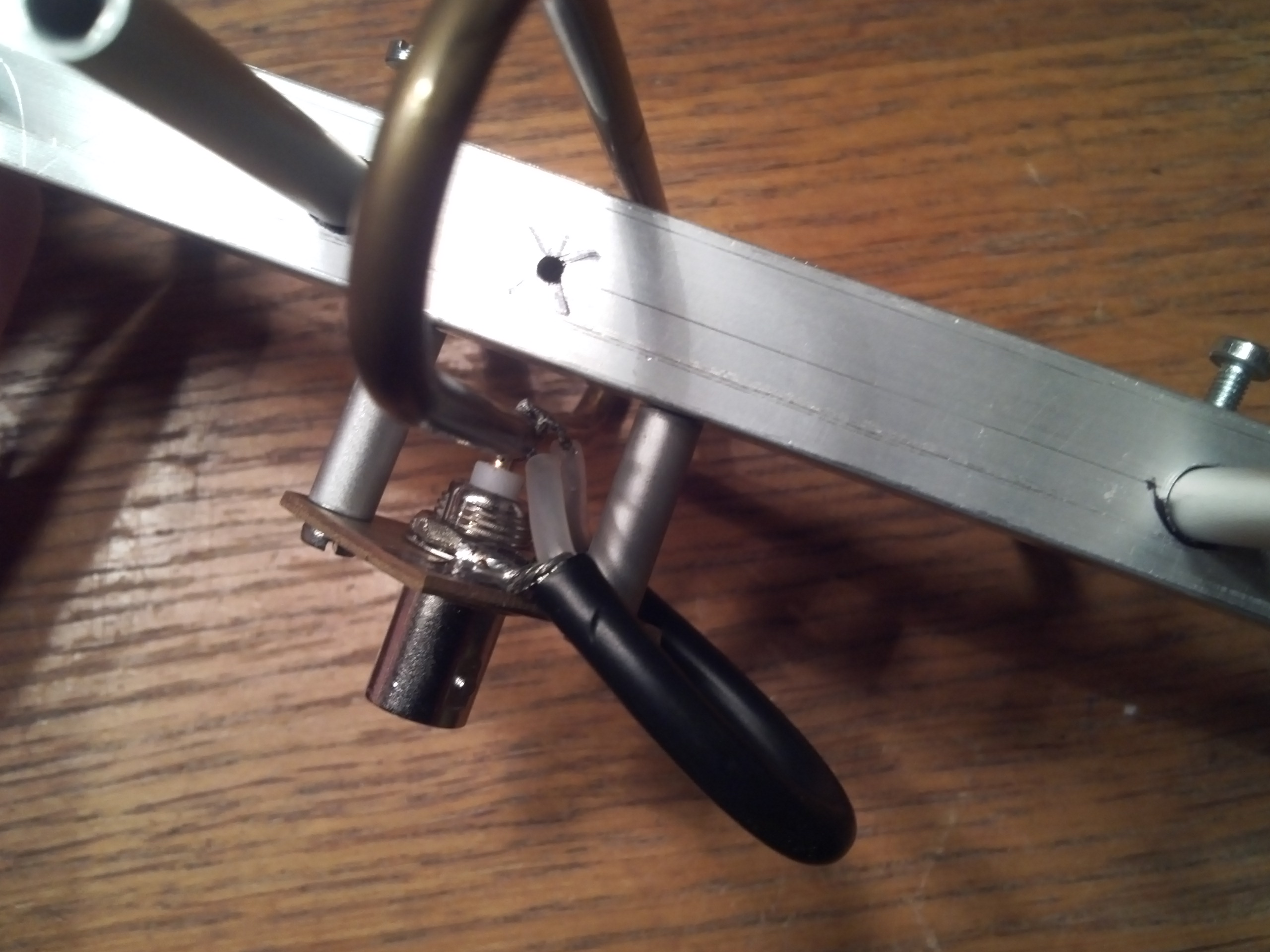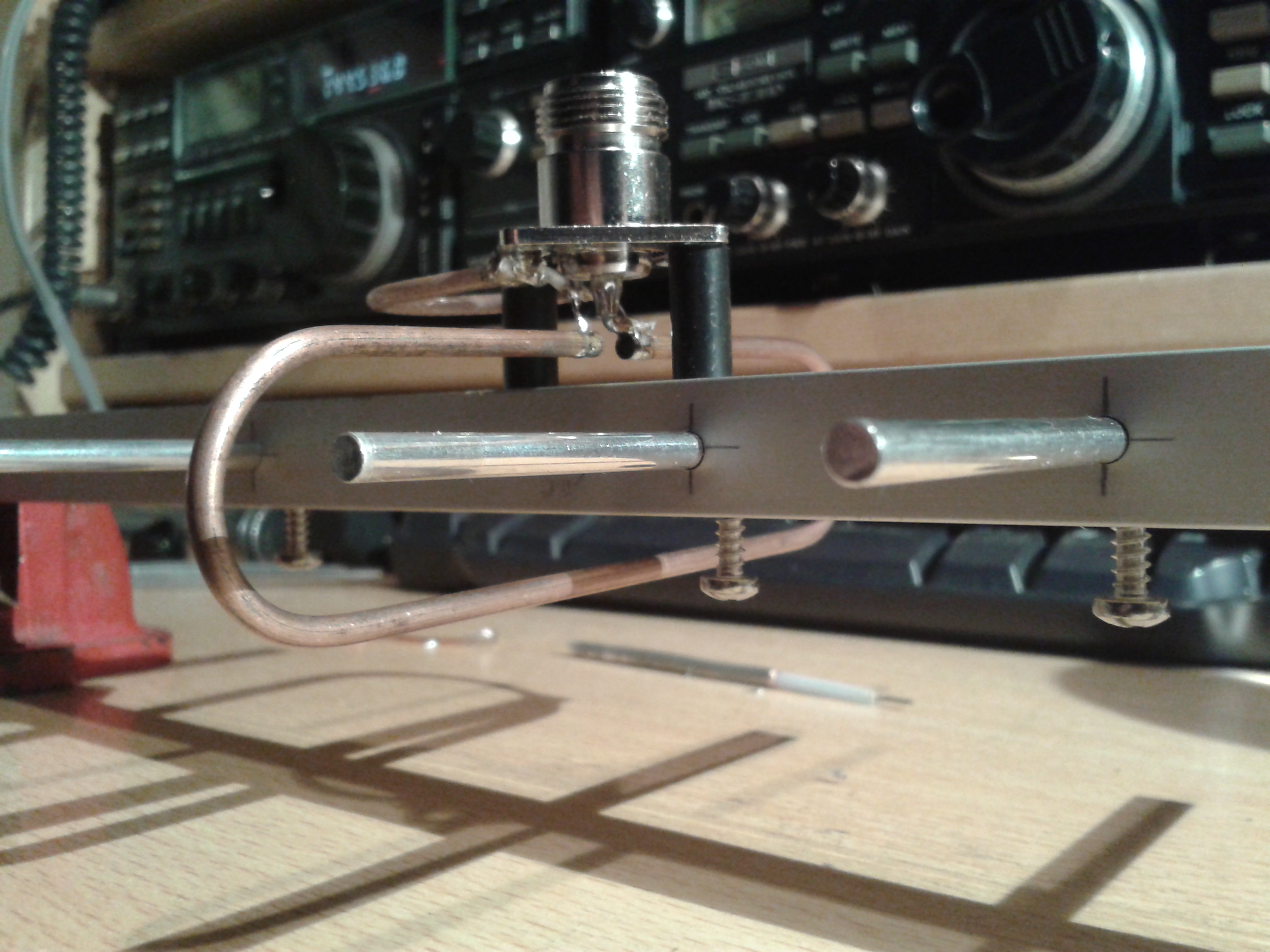 Because of low weight and easy handling I mostly use aluminium to construct VHF/UHF antennas. This material is also easy to drill, saw and grind. You can buy it in most DIY shops. For this antenna I bought an square bar (15x15mm), made of aluminium, length 1 meter. At one end I mounted a standard available mast mount, leaving about 90cm for the actual antenna. Using the DL6WU formulae, this results in a 14 element yagi, with a gain of over 13 dBd. I used the DL6WU spreadsheet calculator of DF2CK to calculate all measurements. Unfortunately DF2CK’s website has vanished. Luckely I kept a local copy of the sheet to calculate your own yagi, click here to download the sheet. I used AlMg3 welding rods for the radials. These rods have a diameter of 4 mm. The dipole is made of 6 mm2 copper wire, matched with a matching loop (1/2 wavelength coax or semi-rigid) and mounted to a female N connector.