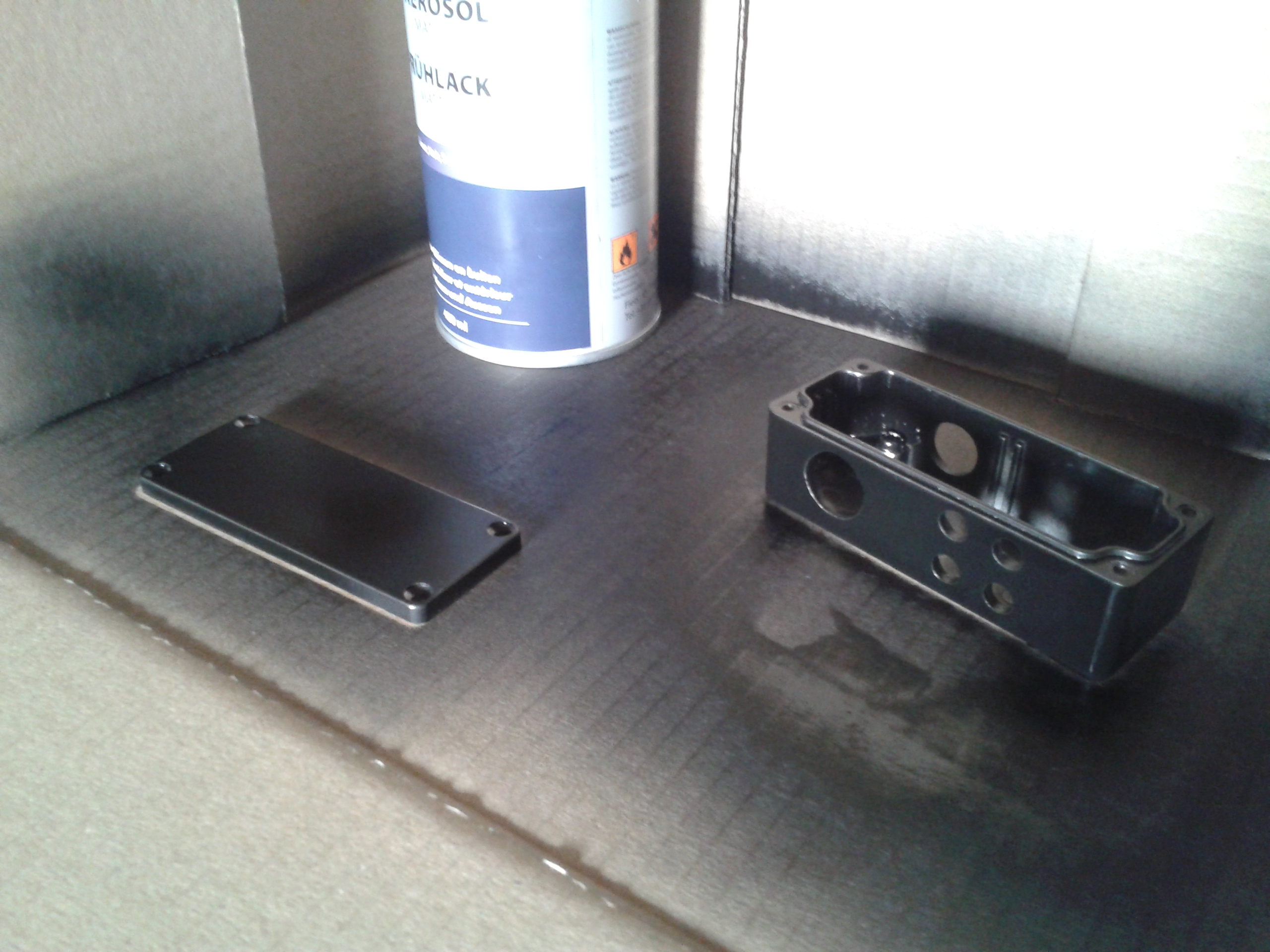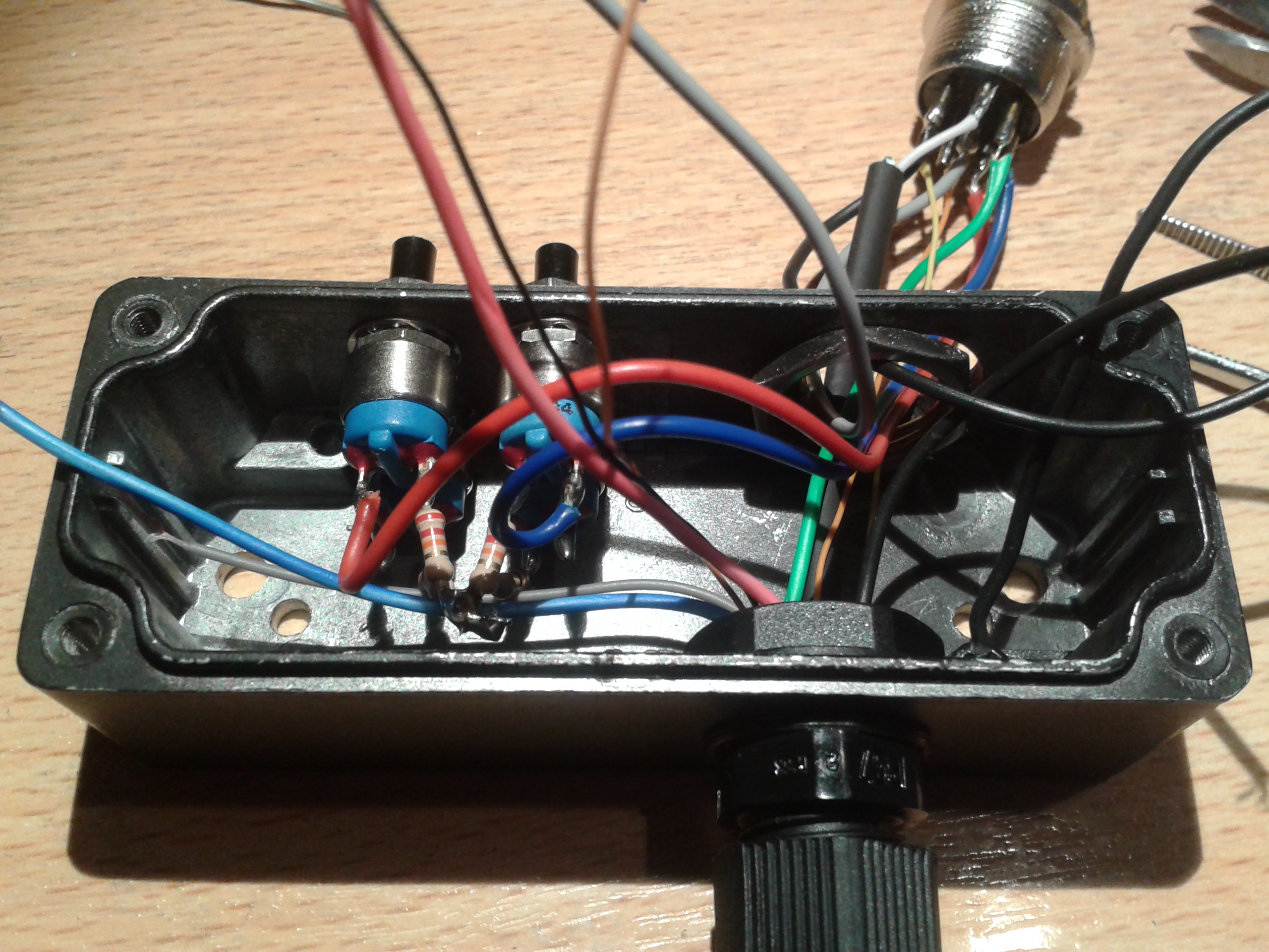 I bought a small aluminium case (Fixapart G102) and drilled two holes in the bottom, these holes align with the existing screw holes on the left side of the TS-2000. I drilled more holes for the buttons, microphone connector and cable mount. Then I painted it black and went listening to the Rolling Stones. The next day the paint was dry and I finished the box by placing all components, soldering the resistors to the switches and wiring all connections.