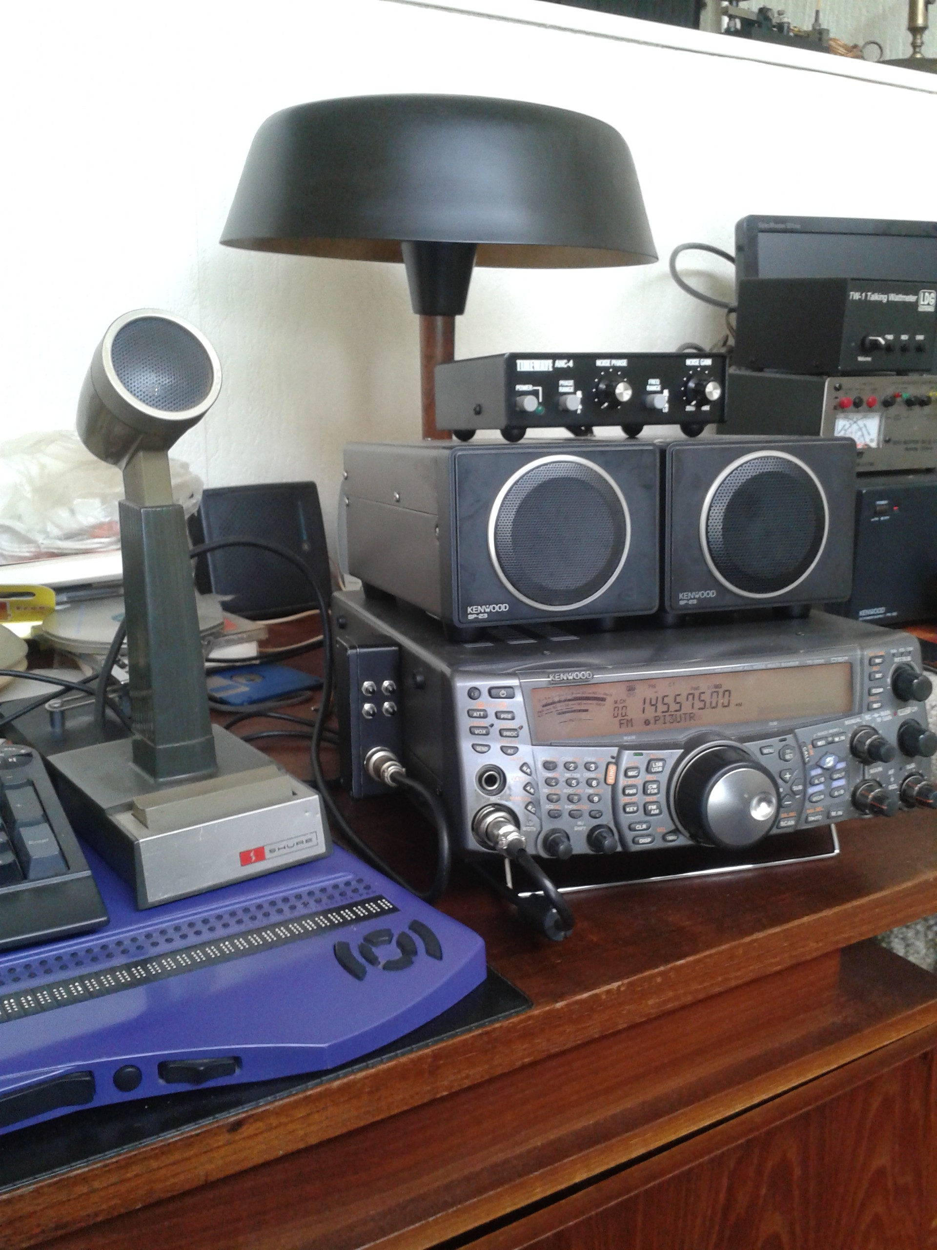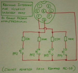 Most mobile and desktop radios of Kenwood have a voice synthesizer option. The voice synthesizer provides accessibility features for visually impaired radio amateurs, like announcing the frequency, memory channel, signal report or selected menu item and their values. To operate the VS-3 you need “programmable funtion keys” (PF1, PF2, etc). You need at least two of these: one to announce the frequency of memory channel, and another one to get the signal report. Unfortunately the TS-2000 has only one PF button. One solution is to use the Kenwood MC-47 microphone, offering 4 PF buttons. A more generic solution is this interface, allowing you to use any Kenwood compatible microphone or head set.