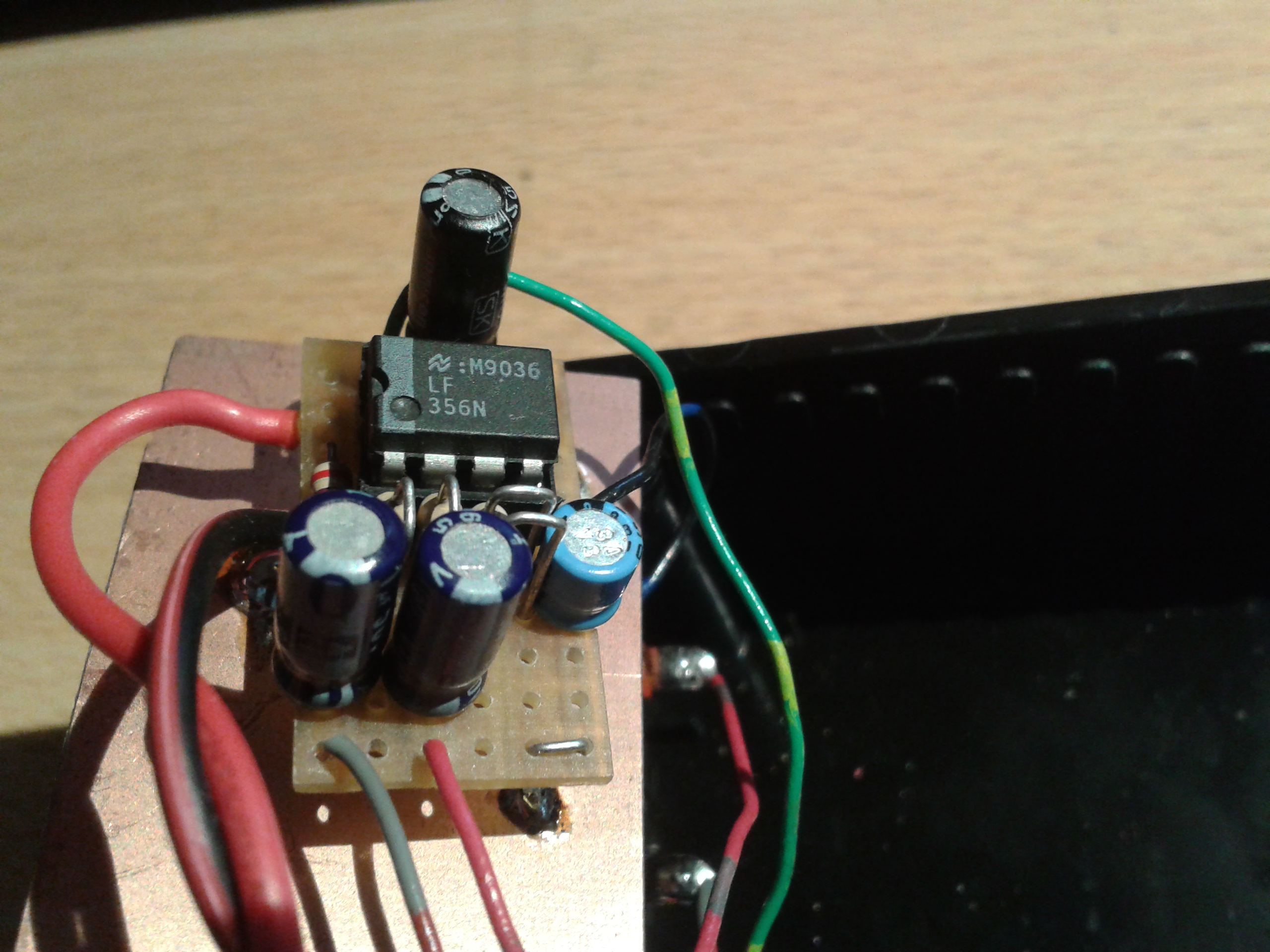 The circuit is a traditional opamp based mixer. The opamp suggested here is a TL072, unfortunately that chip was out of stock here. I found a nice replacement in my junk box: the LF356, although it has a different pin layout. Most opamp’s with FET inputs will probably do the job.