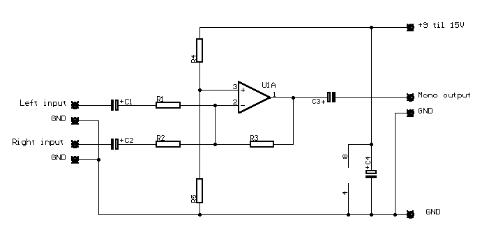 R1 47k R2 47k R3 27k R4 10k R5 10k C1 1uF / 16V C2 1uF / 16V C3 3.3uF / 16V C4 10uF / 50V U1 TL072, OP27, LF356, etc... (check the pin layout of the selected opamp)