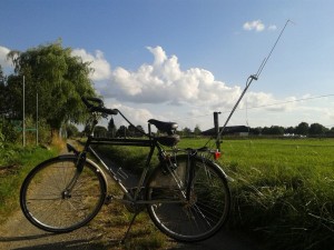 I went on while talking with Adrian, the distance to the repeater increased. During the whole trip the QSO continued without any problems. Sometimes people along the road looked a bit funny, wondering about that strange guy passing by, with a headset and some strange pole on the back of the bicycle. Even when I was at the ferry (which is very low, just above the water and behind a dike) I was able to continue the QSO, maritime mobile with my bike (outstanders could think I was on a paddle boat hi).