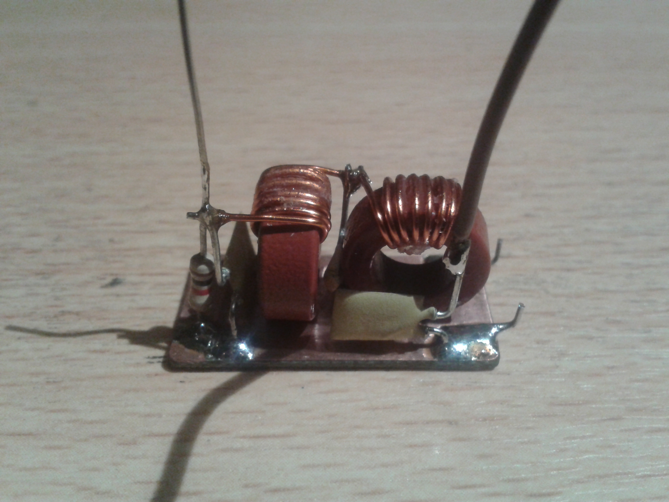 I still had some room left in the case, more than enough to house the lowpass filter. I built it on another small piece of copper clad. Since I worried a bit about the power characteristics of those resistor-shaped inductors I made these myself, each inductor made of 8 turns of shielded copper wire on a T50-2 core.