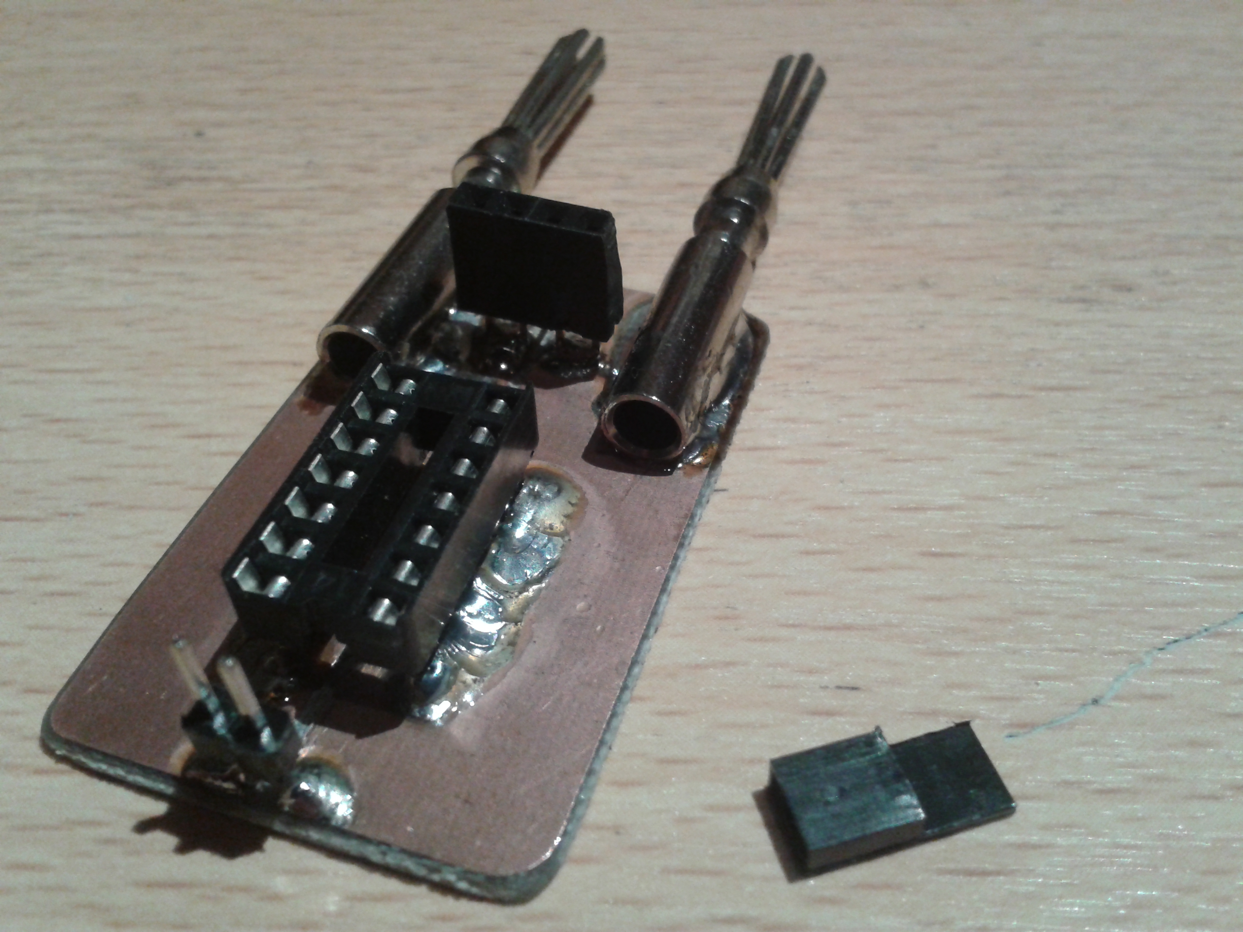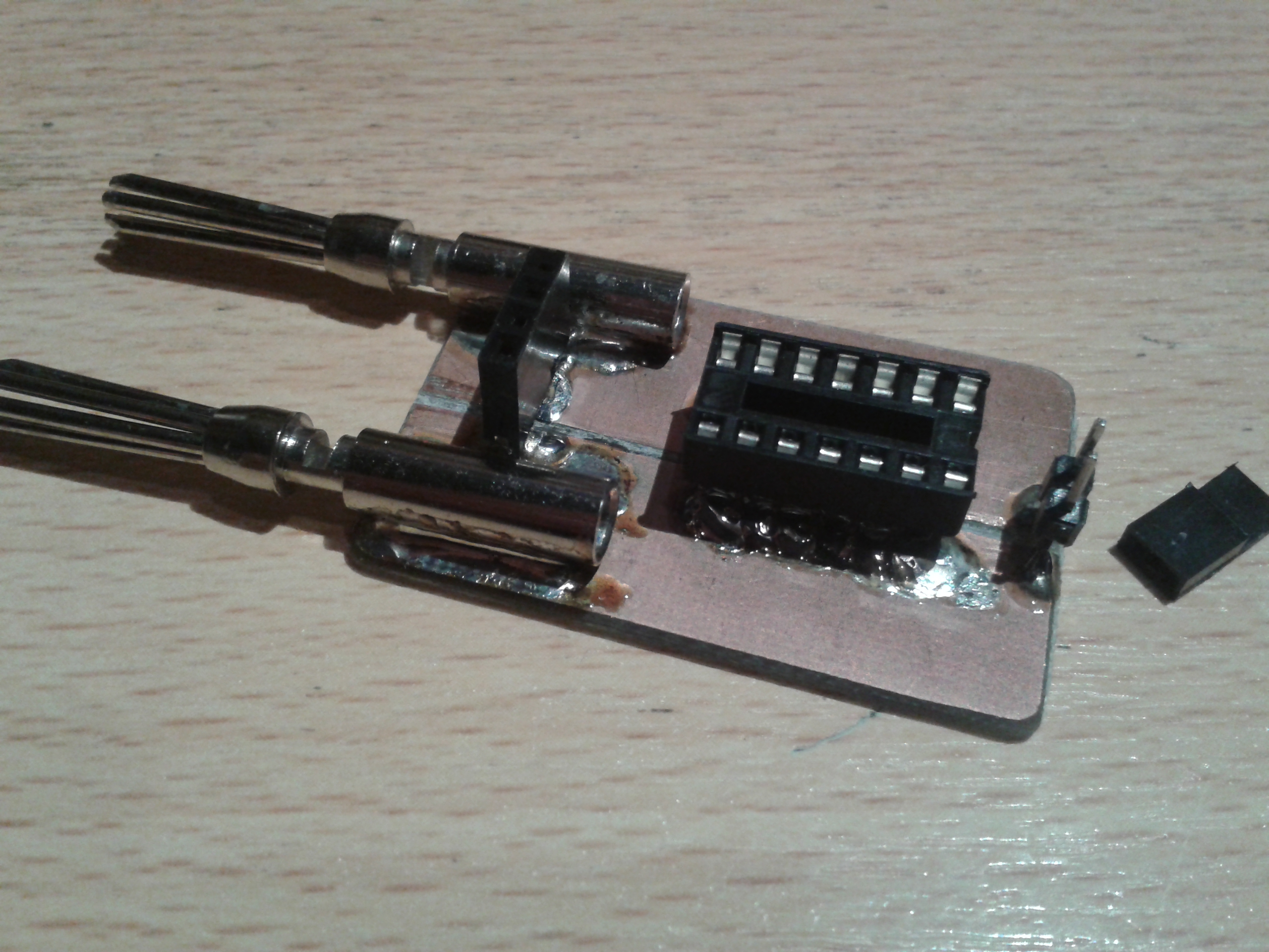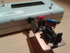 The adapter is made of copper clad. I cut the copper in the middle and soldered a 4mm connector on each side of the gutter. I soldered an IC socket and a 2-pin jumper, both above the gutter. The jumper makes it easy to shorten the adapter (required for callibration when measuring inductances). Just look at the pictures down here and I’m sure you can build your own adapter. Just modify the connectors (probably just the spacing) to use the same idea on any other LC meter.