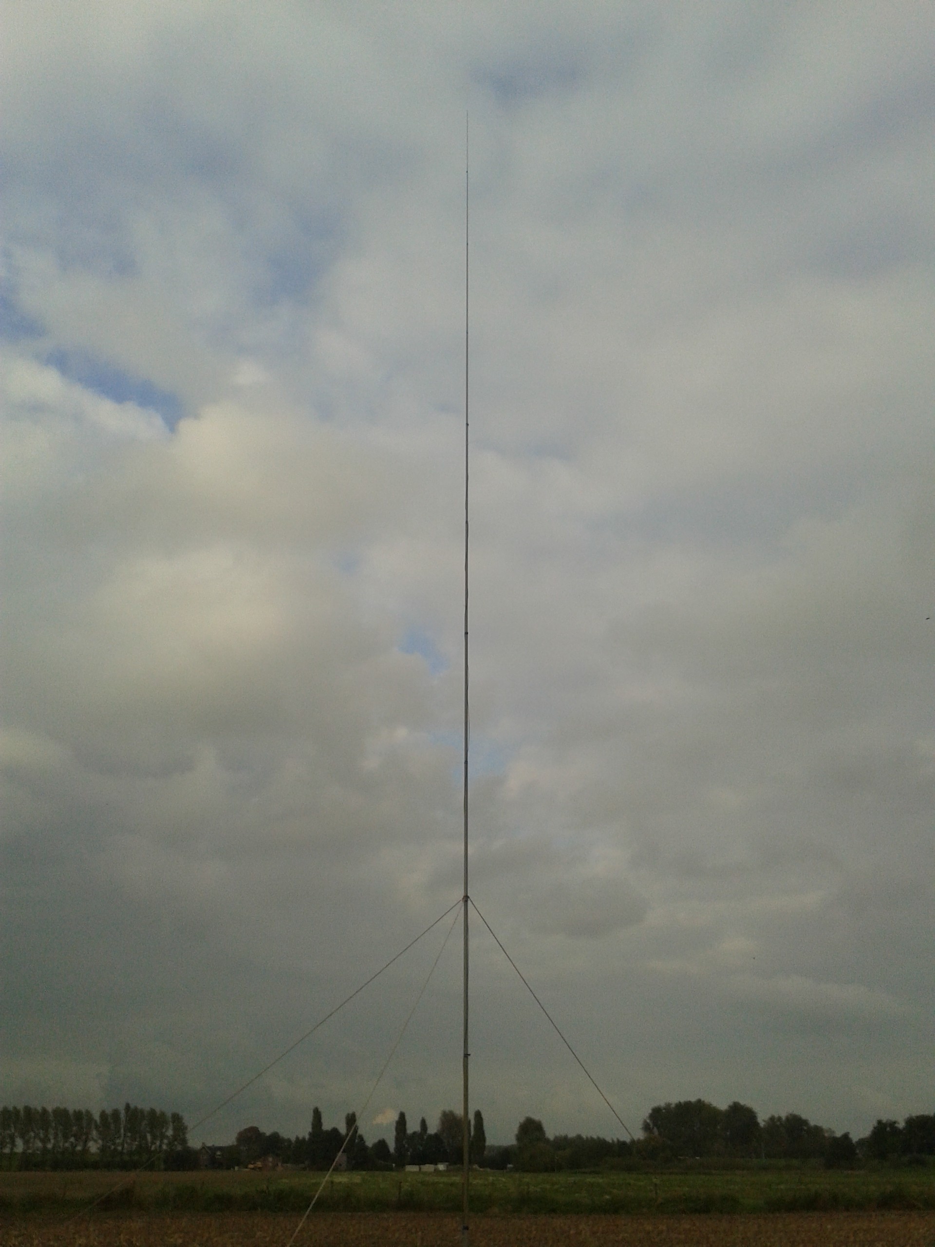 Adrian PA0RDA and I once bought a bunch of glass fibre masts with a length of 12.5 meters to do experiments with vertical antennas. After a successful experiment with a 1/4 wave vertical for 40m we wanted to build a vertical for 20m too. The fibre masts are just tall enough to hold a 5/8 vertical for 20m, the idea of building a 5/8 was born. After studying different types of verticals we concluded that the 5/8 would be the best vertical for our goal (international contesting and DX’ing).