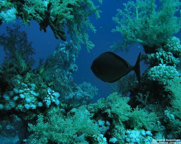 Blue Spine Unicornfish A lucky shot. The fish is beautifully framed by all kinds of soft corals.