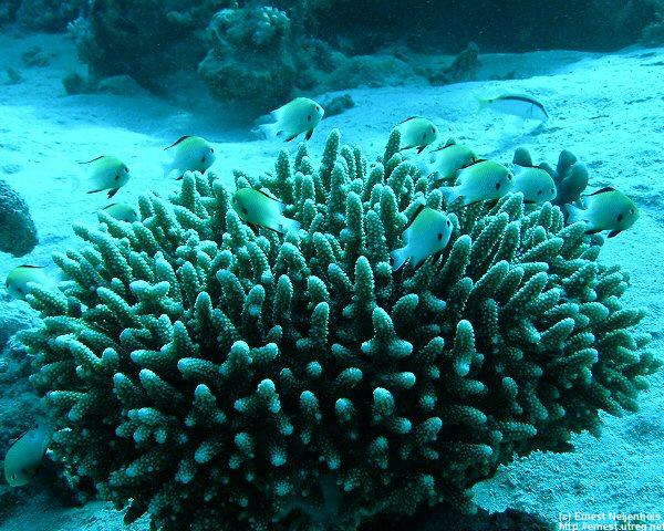 Arabian Damsels These species are found in small groups on branching corals. When you see them from a distance, about 10 of them swim just above the coral. When you get closer, they hide between the branches.