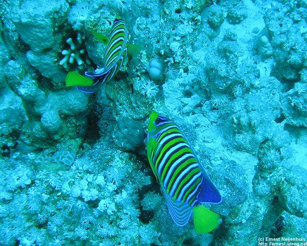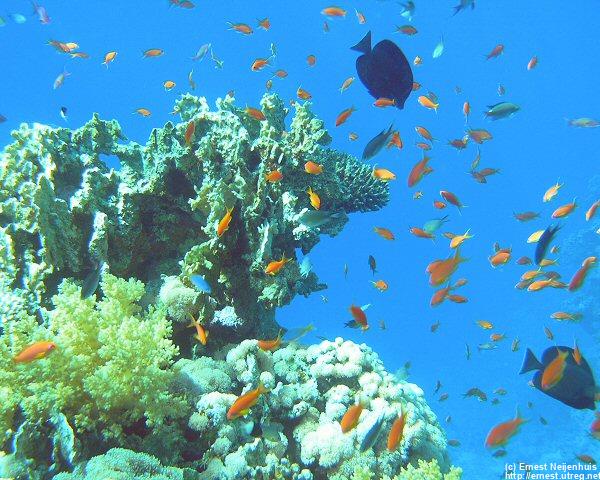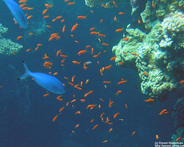 Red Sea Fairy Basslets and Red Sea Fusiliers On nearly every block of corals you will find these small orange coloured fish. They live in harems. In the middle you see a brown coloured fish of the same size, this is the male. All others are female. When the mail dies, the biggest female fish will transform into a male. The blue fusiliers are also commonly seen in the Red Sea. You will find them just below the surface.