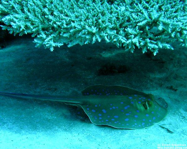 Bluespotted Stingray We saw several of them, most of the times hiding under a big coral or rock.