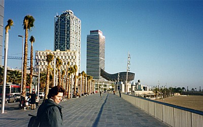 | Vila Olympica - Het olympisch dorp ligt tegen het centrum aan. Vanaf de boulevard is het direct te herkennen aan de 2 grote flatgebouwen en de metalen dakconsctructie die een vis voor moet stellen. |