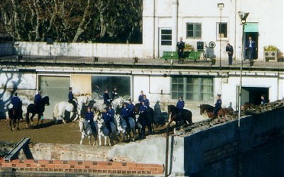 | - Net voorbij het olympisch dorp, vlakbij de dierentuin, zien we over een muurtje een groep ruiters oefenen. Ze dragen mooie uniformen. Vanaf het bordes krijgen ze instructies. |