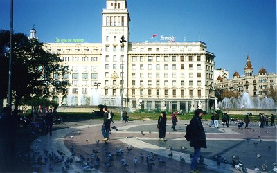 | Plaza del Catalunya - Aan het einde van de Ramblas ligt dit leuke plein, dat gedomineerd wordt door duiven. Vele mensen zitten hier 's middags lekker op een bankje te genieten van de zon en alle aktiviteit op en rondom het plein. |