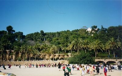 | Parc Guell - Bovenop de zuilengalerij is een grote plaats waar vele mensen lekker van de zon genieten op de lange Gaudi-bank. Kinderen rennen op en neer en doen spelletjes, en groepen Japanse toeristen lopen op en neer om even uitzicht te hebben over het centrum van Barcelona. |