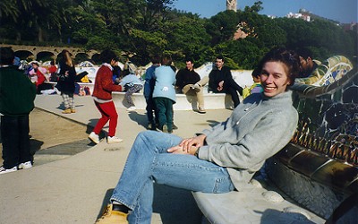 | Parc Guell - Angela vindt het hier heerlijk, en ze is niet de enige die hier van de zon en de mooie omgeving geniet. Die Gaudi-bank zit zo slecht nog niet... |