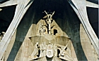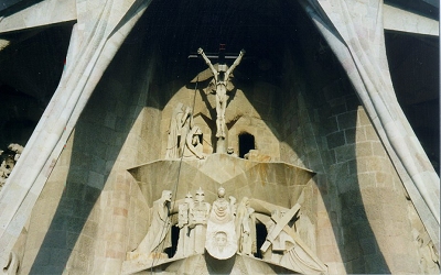 | Sagrada Familia - Aan de andere kant zijn er allemaal beelden geplaatst, waaronder ook een kruisbeeld. Opvallend detail hier (niet op de foto) is ook een logisch vierkant. Wat heeft dat nou met de kerk te maken? |