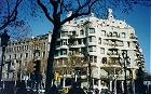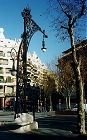| Casa Mila - Langs de straat staan fraaie lantaarnpalen met Gaudi-banken. Ze passen goed bij Casa Mila. |