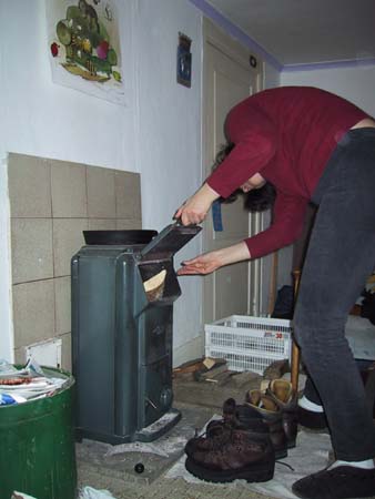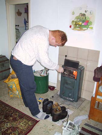 Nog even een houtje op de kachel, dan blijft het lekker warm, en kunnen de schoenen weer ontdooien en drogen.