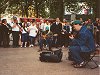 Ik zit hier momenteel met mijn rug tegen een lantaarnpaal en mensen om mij heen denken vast dat ik een journalist ben of zo, gewapend met pen, papier en fototoestel. Gisteravond zag ik een prachtige act van iemand die continu op het publiek inspeelde. Zo rende hij plotseling met een pruik naar een kale man. Een paar minuten later controleert hij bij een vrouw met een pruikachtig kapsel of het inderdaad wel echt haar is. Helaas, het is echt... Het publiek ligt in een deuk van het lachen, terwijl het toevallige slachtoffer niet begrijpt waarom. Voor mij is de kring mensen inmiddels flink gegroeid. Ze kijken en luisteren naar en duo dat met Spaanse gitaar en bas een aardig Spaans sfeertje neer weet te zetten. Een enkeling danst midden in de kring mee en probeert anderen ook uit te lokken. Het lukt niet echt, het publiek is nogal verlegen. Even verderop zet een groep op diverse Afrikaanse trommels een opzwepend ritme neer. Nog verderop danst een groep uit Zimbabwe een of andere tropische dans. Ja, Leicester Square is altijd een leuke afsluiting van de dag, een uitstekende plek om tot rust te komen (of niet) na een lange dag slenteren door de stad. Inmiddels zit de Spaanse sfeer er goed in, en dansen enkele stellen nu met veel passie en plezier, of ze doen gewoon gek mee, aangemoedigd door enkele vrienden die in het publiek staan.