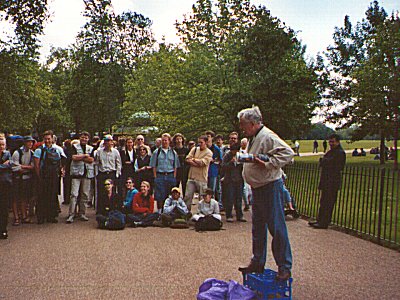 Hoewel het discussieren hier veelal is afgedaald naar entertainment, blijft het toch een bijzonder plekje. Je pakt een kratje, je gaat erop staan, je schreeuwt wat uitdagengde stellingen, en je hebt publiek. Nu is het niet allemaal zo spontaan als dat het lijkt. Ik zie al 3 bekende gezichten, gezichten die ik hier enkele jaren geleden ook al zag. Ze staan hier iedere week. De een doet het voor de lol, de ander omdat hij volledig overtuigd dat hij iets zinnigs te melden heeft. Maar geen van allen doet het om geld. En dat is nou het mooie van deze happening: het gaat hier nu eens niet om de knikkers. Dus als je ooit naar Londen gaat, neem dan op zondagochtend de metro naar Marble Arch en beleef dit unieke gebeuren. Voor mij is het nu een prachtige afsluiting van mijn korte vakantie.