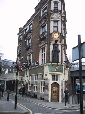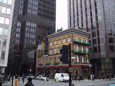 Dit zie je veel in London: authentieke gebouwen (zoals deze pub), omringd door moderne kantoorreuzen. Niet mooi, maar wen er maar aan, want London staat er vol mee.
