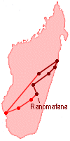 De wandeling duurt ruimt 4 uur, en voert ons dwars door het regenwoud. De paden zijn vaak slecht, en sommige stukken moeten we veel stijgen en dalen, terwijl we ons aan bomen en struiken vast moeten pakken om niet het dal in te glijden. En dan kun je niet eens zo maar alle bomen en struiken vastpakken, want sommige hebben flinke stekels, en anderen zijn in gebruik door mieren of termieten. Onderweg zien we weer de nodige lemuren. We komen 3 soorten tegen. We beginnen zo langzamerhand wel gewend te raken aan de aanwezigheid van deze bijzondere diertjes. Tegen het einde van de wandeling hebben we een hele lange en steile afdaling. Hoe verder we gaan, hoe meer we onze kuiten beginnen te voelen. De spieren trillen gewoon van de inspanning. Maar het is wel de moeite waard, want we komen uiteindelijk bij een prachtige waterval uit. Na een korte stop wandelen we naar het dorp en zijn we nog net voor de regenbui in het hotel (Hotel Manja). De regenbui verpest geenszins de sfeer, want op de (overdekte) veranda spelen we urenlang hartenjagen. De clos Malaza zorgt wederom voor een gezellige sfeer, en de dubbelzinnige opmerkingen vliegen over de tafel. Zo "duikt" Edwin onder Gaby, terwijl ik steeds voor de schoppenvrouw ("schop een vrouw") ga. |