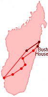 Na de lunch (stokbrood met omelet) neemt Bambino ons mee het achterliggende bos in. We gaan een wandeling maken over de heuvels achter het Bush House. Op het eerste gezicht lijken hier alleen reizigerspalmen te groeien, maar als je wat verder kijkt, zie je een veelvoud van planten: allerlei mooie bloemetjes, plantjes die hun bladeren dichtvouwen op het moment dat je ze aanraakt, etc.