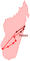 Het eerste deel van de wandeling staat in het teken van de Indri Indri. Dit is de grootste lemurensoort. Het dier heeft een zwartwitte vacht, en lijkt net een teddybeer. Ze leven hoog in de bomen, dus je krijgt er wel een stijve nek van om naar te kijken. Vaak is het ook flink wringen om door het woud bij de dieren te komen. Het geluid van de dieren is werkelijk uniek, en zit ergens tussen een huilende wolf en het gemiauw van een kat in. Het is keihard, en tot ver in de omtrek te horen. Als er meerderen tegelijk schreeuwen is het helemaal een prachtig muzikaal hoorspel. Na het bezoek aan een aantal Indri-families (er zijn er hier 63) gaan we dieper het regenwoud in. Onderweg zien we een groepje wollemuren. Dit zijn nachtdieren. Ze zitten boven in een boompje met z'n vieren dicht tegen elkaar aan gekropen en slapen. Verder krijgen we diverse soorten reptielen te zien. Behalve gecko's en hagedisjes zien we 4 soorten kameleons, waaronder een een heel kleintje dat je niet vaak te zien krijgt. Ook de insekten zijn zeer interessant. Zo zien we een grote donkerbruine sprinkhaan van bijna 10 cm lang, en ook nog een jonge groene sprinkhaan van eveneens 10 cm. Die zal straks uitgroeien tot een reuzensprinkhaan van zo'n 25 tot 30 cm! Ik moet er niet aan denken om die 's avonds op mijn slaapkamer tegen te komen, brrr... Tegen het einde van de wandeling komen we nog een grote duizendpoot tegen. Deze is zo'n 12 cm lang en 5 cm breed, en lijkt meer op een soort enorme pissebed. Hi heeft een prachtig donkergroen schild. Als we 'm voorzichtig aanraken, rolt hij zich op tot een mooie bal. Het is werkelijk een bijzonder dier, met een prehistorisch uiterlijk. Na zo'n 6 uur lopen, klimmen, modderen en glibberen zijn we weer terug bij de ingang, met zo'n 11 km voetsporen achter ons. Bij het souvenirwinkeltje koop ik een mooi schaakbordje, gesneden uit hout. Bij het parkrestaurant nemen Gaby en ik een stevige lunch en gunnen we onze voeten wat rust. Dat hebben ze wel verdiend na zo'n tocht. Het weer is opnieuw zonnig en warm, dus het is heerlijk om een tijdje hier te zitten. Als we weer tot rust zijn gekomen, lopen we terug naar het hotel waar de rest van de groep inmiddels is gearriveerd. Met de bus nemen we een kijkje in het dorpje Andasibe. De bewoners kijken hun ogen uit naar ons, en vooral het rode haar van mij en Hilde trekt veel aandacht. De kinderen willen maar al te graag op de foto, en hun verleidelijke blikken weten ons dan ook regelmatig over te halen. Sommigen geven ons hun adres mee, met het verzoek om de foto op te sturen. Weer terug in het hotel komen de kaarten op tafel om te gaan hartenjagen. Dit houden we vol tot het avondeten. |